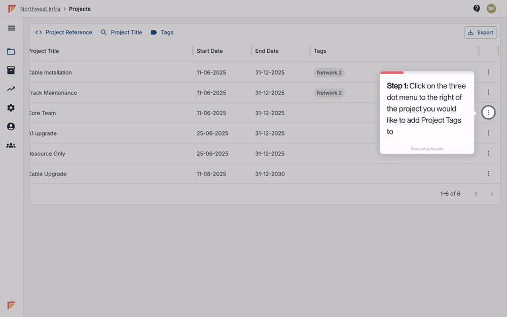 On the Project overview screen, Click the hamburger menu to the right of the Project you would like assign a tag to.